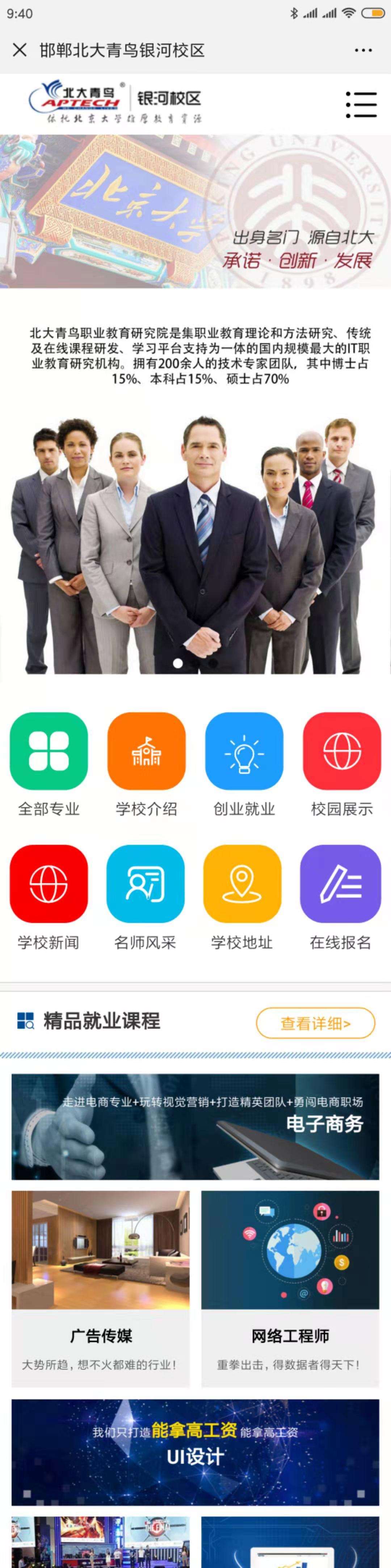 新聞?wù)?邯鄲冀南新區(qū)銀河中等專(zhuān)業(yè)學(xué)校,是北大青鳥(niǎo)總部在邯鄲地區(qū)唯一授權(quán)培訓(xùn)中心:北大青鳥(niǎo)(邯鄲)銀河校區(qū)。學(xué)校位于邯鄲冀南新區(qū)緊鄰邯鄲機(jī)場(chǎng),學(xué)校開(kāi)設(shè)了啟蒙星、軟件工程、Ui 設(shè)計(jì)、網(wǎng)絡(luò)工程師、游戲動(dòng)漫、廣告?zhèn)髅健㈦娮由虅?wù),是邯鄲地區(qū)規(guī)模較大的IT學(xué)校。